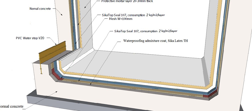 Hồ nước uống, giải pháp chống thấm bằng lớp phủ và hệ thống trám khe